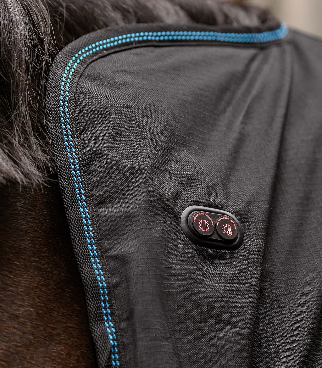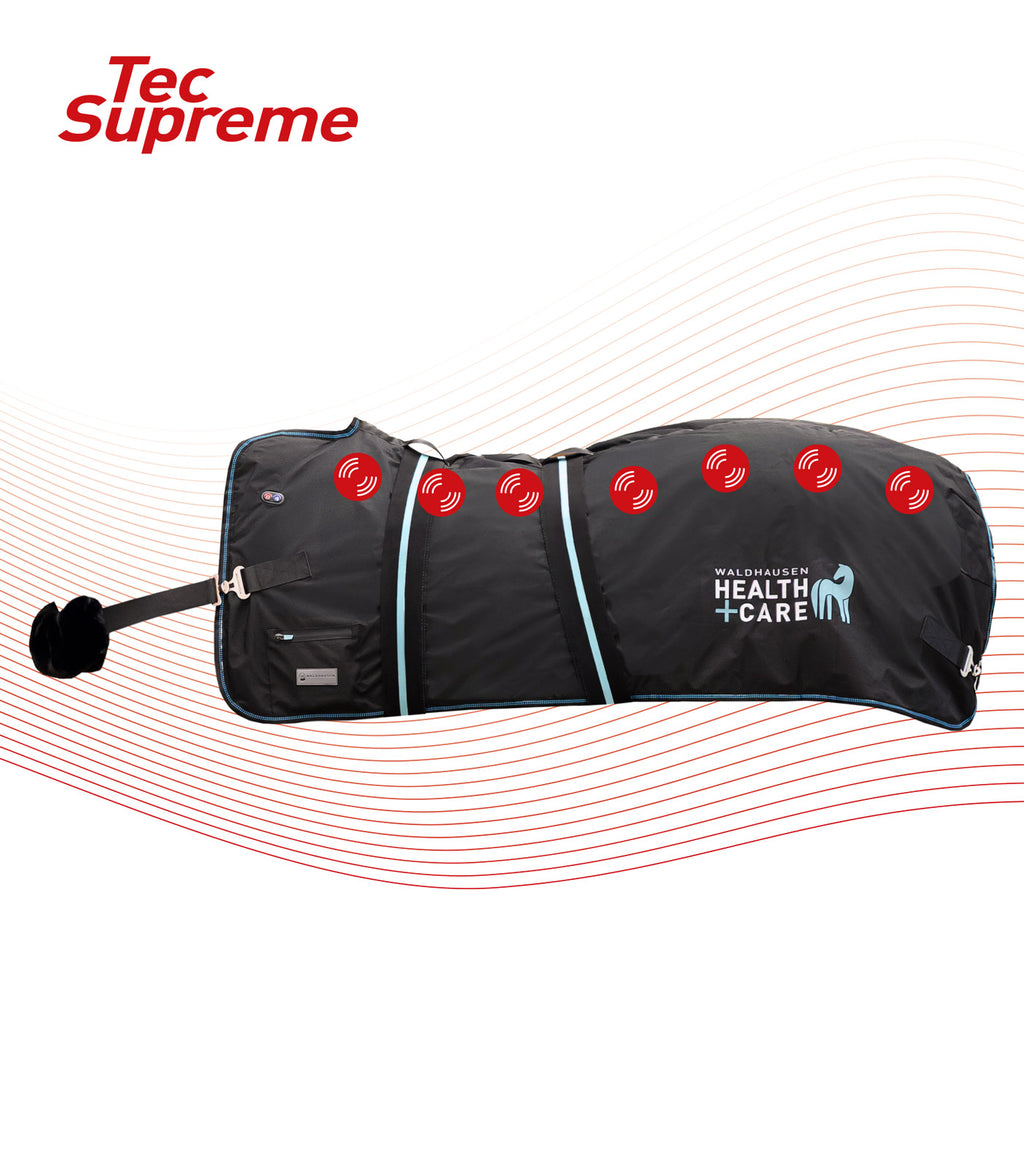 Well-being at the touch of a button. The Waldhausen Health + Care TecSupreme heating and massage rug specifically relaxes tense muscles, promotes blood circulation and supports regeneration. Each side of the rug has its own heating system and seven integrated massage buttons. Both sides can be controlled individually and independently of each other. Fast, effective and super easy to use. Whether it"s for use before training, after work or simply for pampering: your horse will experience warmth and massage just like in its own wellness spa.